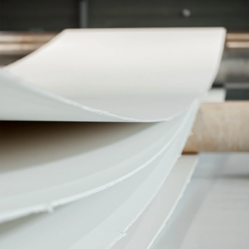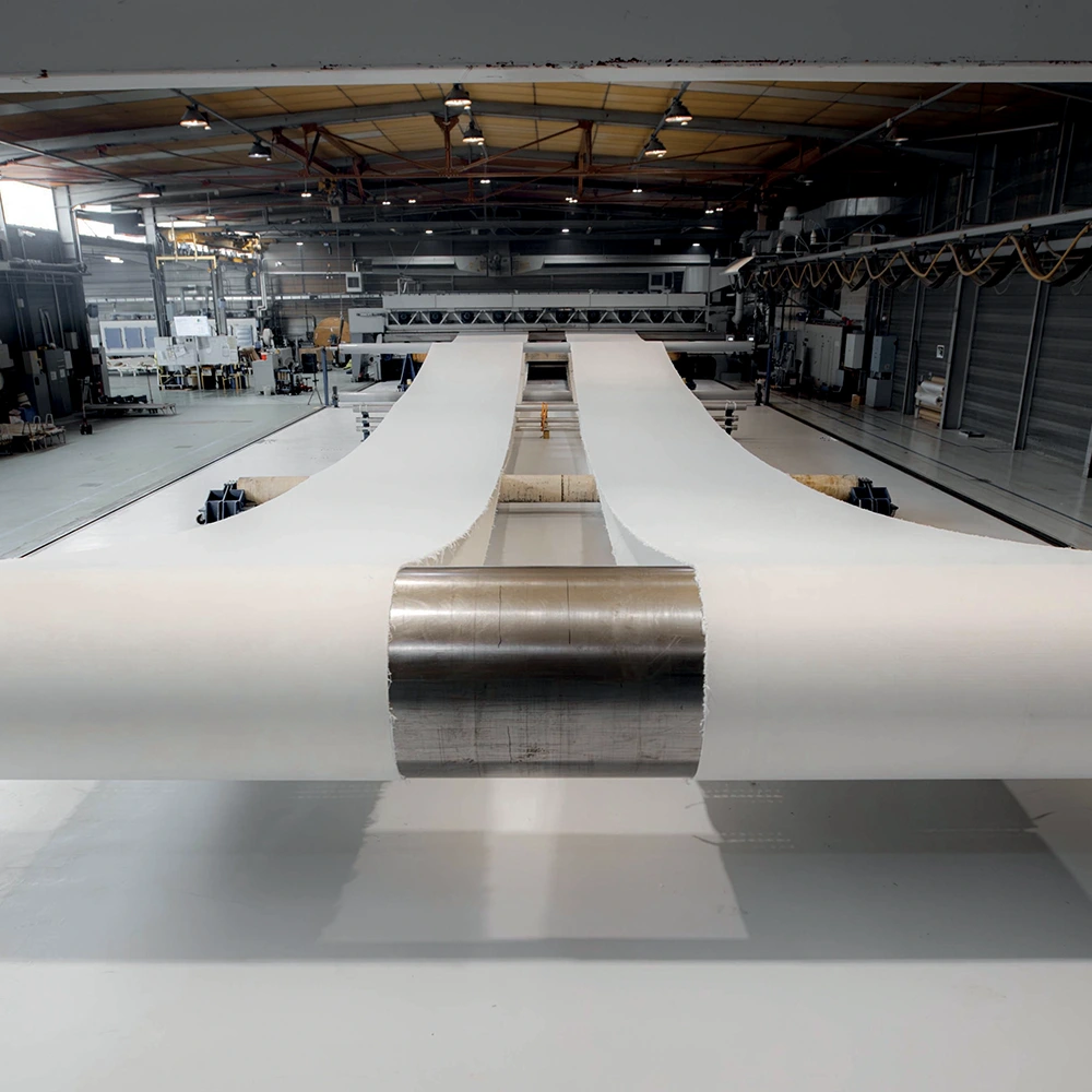 At Bricq, the process of heat setting is made by contact in a dry-heated environment. In this method, the heavy duty fabric is run in contact with heated metal surface cylinders filled with a liquid known as diatherm to uniformly distribute the heat. This is a highly critical operation which will avoid your corrugator belt to stretch and elongate.